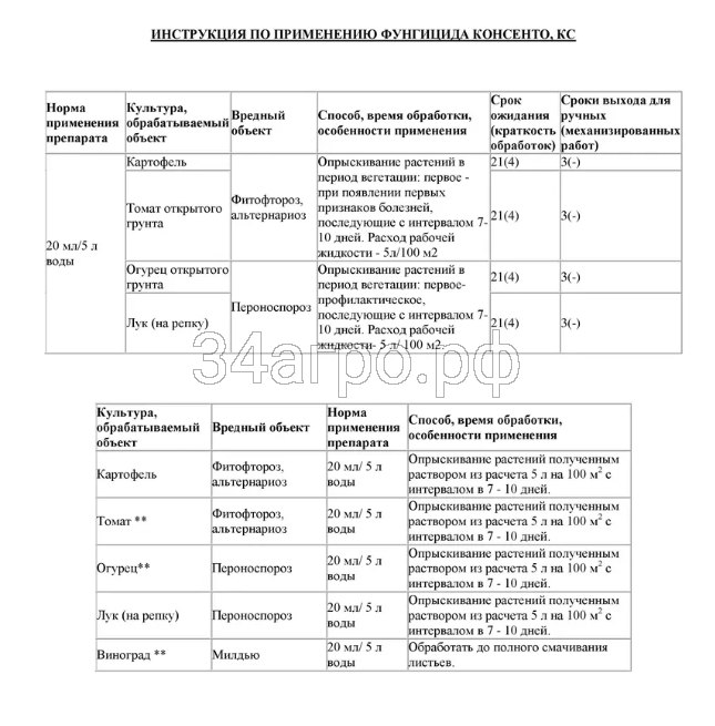 Консенто обладает отличной дождестойкостью и начинает действовать в течение 1 часа после обработки.